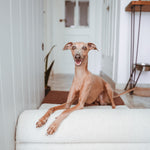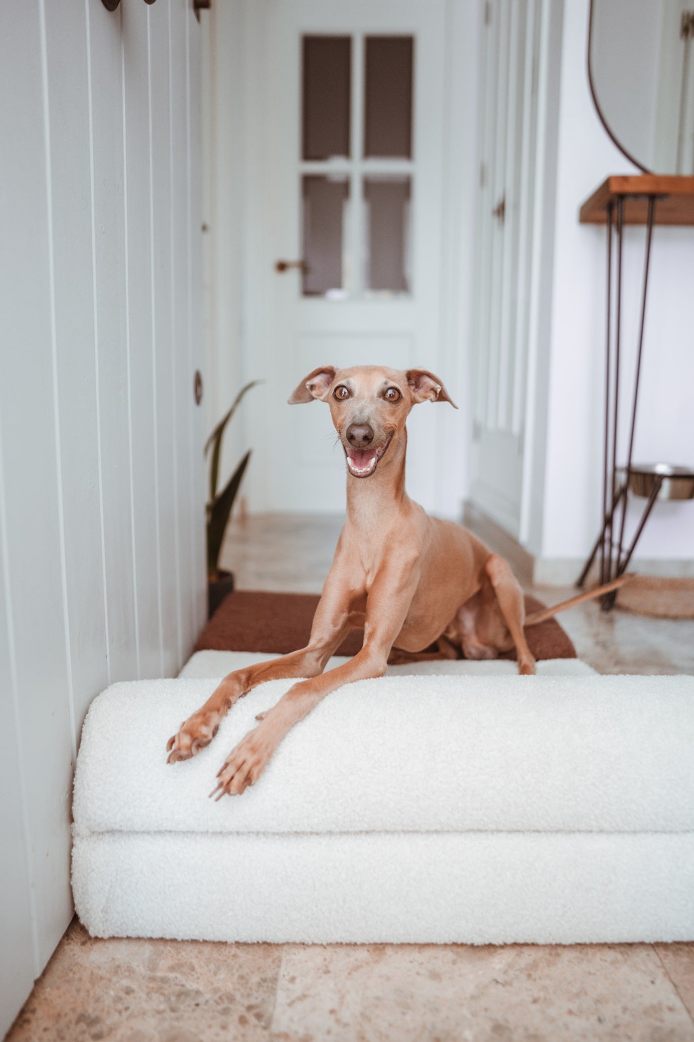La cama para perro Quelle está tapizada con tejido bouclé técnico: suave, duradero y fácil de limpiar. Su núcleo ortopédico de triple capa —espuma, viscoelástica y guata— ofrece un descanso mullido, firme y ergonómico.